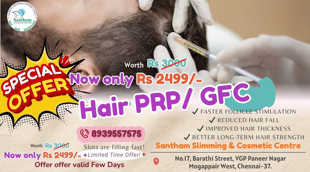 At Santham Slimming & Cosmetic Centre, Mogappair West, we offer advanced PRP (Platelet Rich Plasma) and GFC (Growth Factor Concentrate) treatment in Chennai to control hair fall and stimulate healthy regrowth after treating the underlying scalp condition.