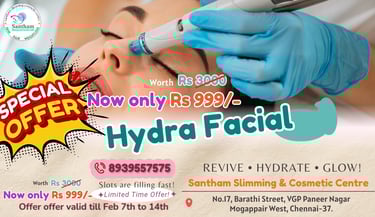 At Santham Slimming & Cosmetic Centre, Mogappair West, we offer medical-grade Medi-Hydra Facial, designed to deeply cleanse, hydrate, and rejuvenate your skin safely and effectively.